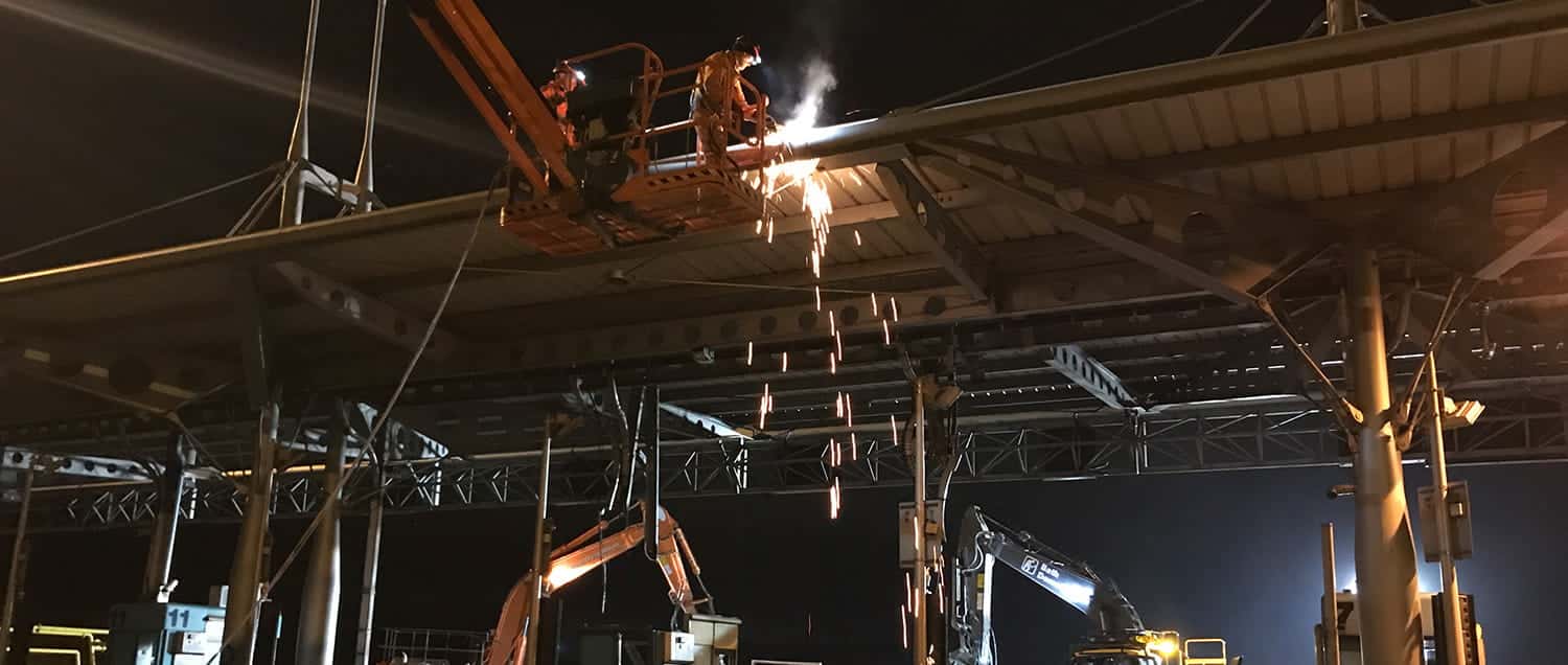 Separation of the canopy was carried out by use of MEWPs with a Hot Works Permit in place, and removal by mechanical methods using 360 Excavator with a shear attachment. The remaining structures were demolished using 360 Excavator.
